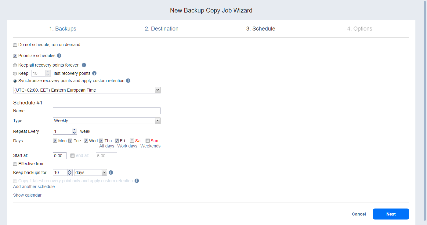 Keep backups for: Specify how many days, months, or years NAKIVO Backup & Replication should keep the backups.