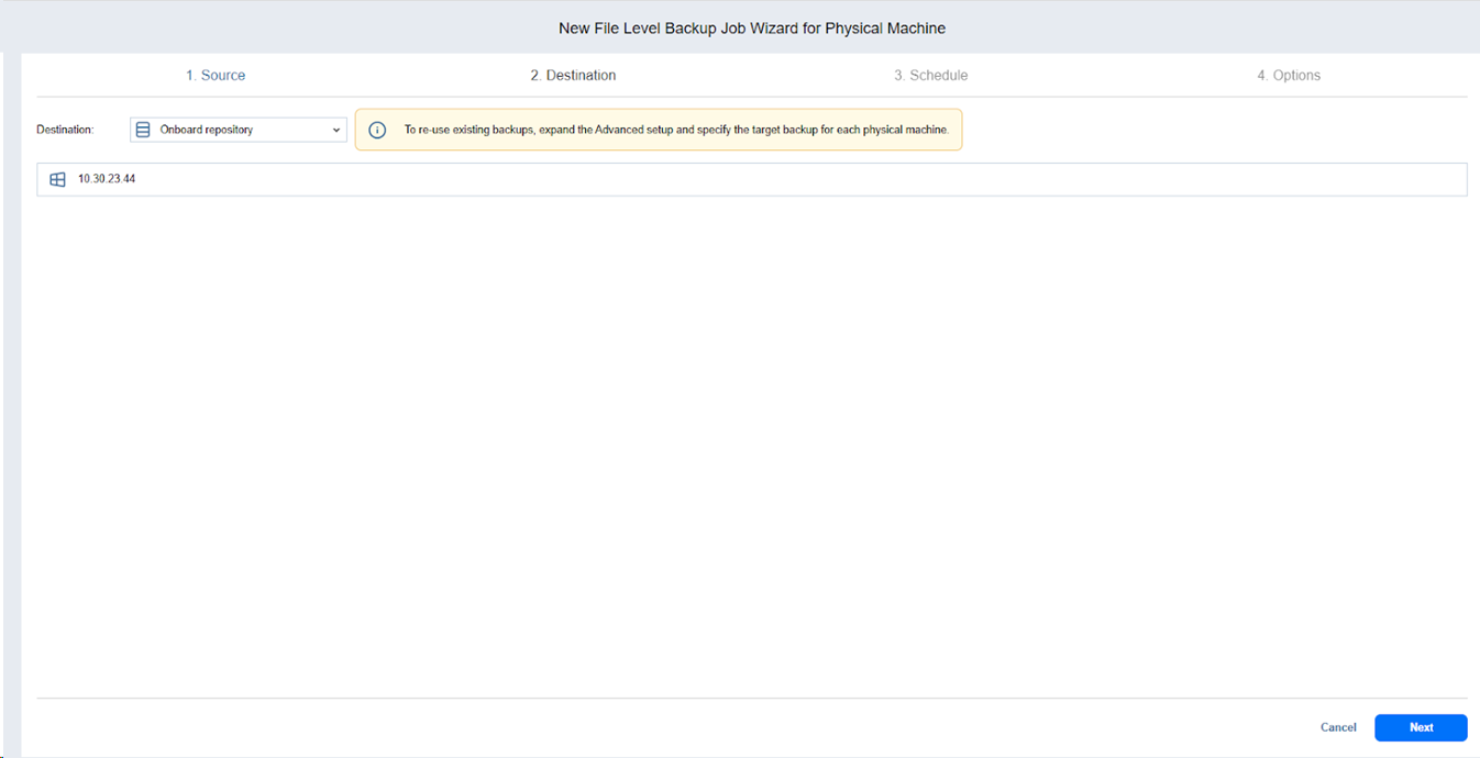 To back up selected volumes and folders to a single repository, choose a backup repository from the Destination drop-down list and then click Next.