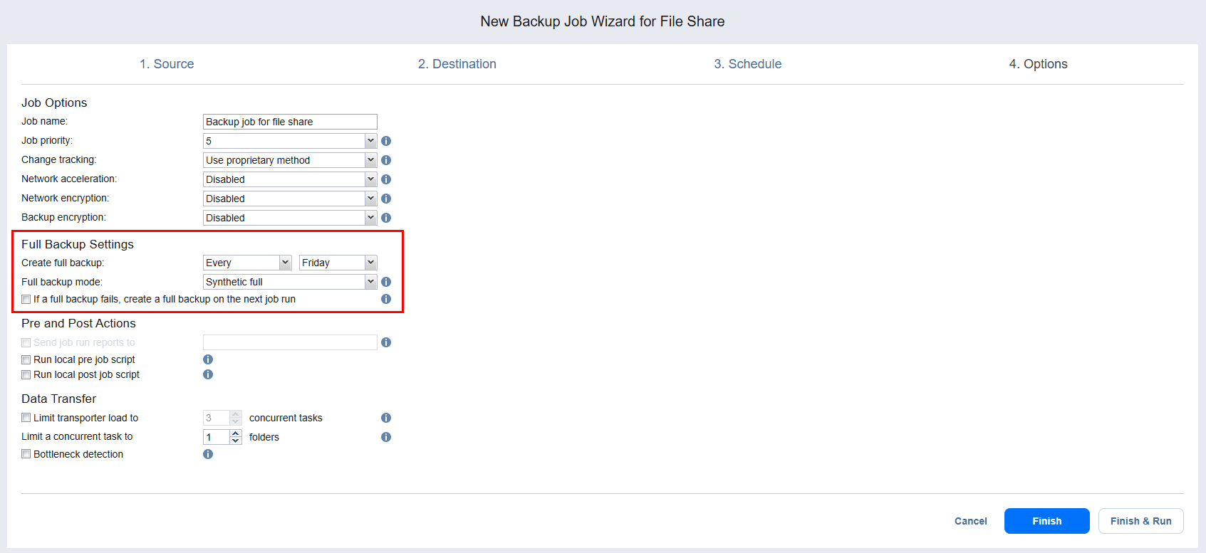 If a full backup fails, create a full backup on the next job run: With this option selected, the next job run creates a full backup if the current job run fails to do so.