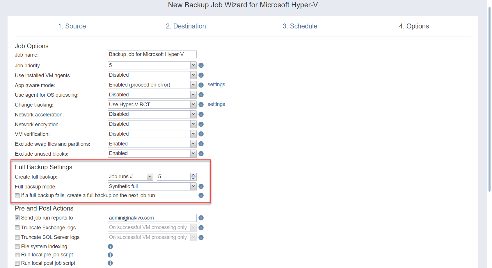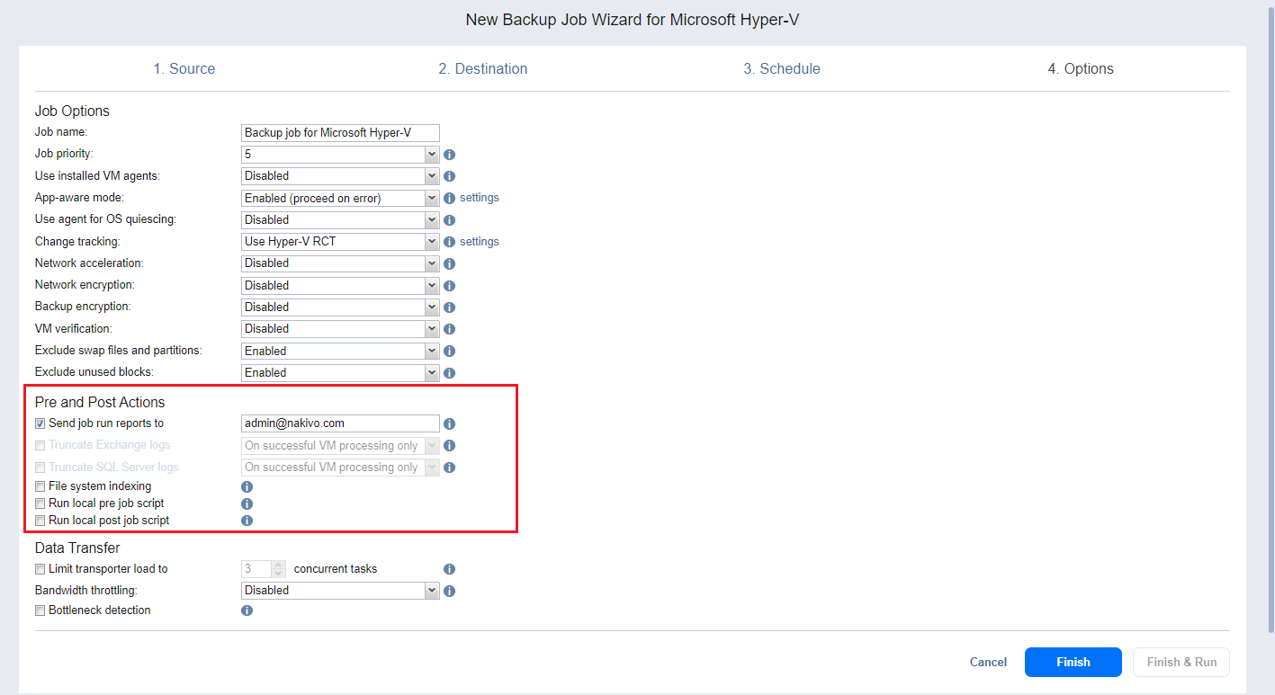 NAKIVO Backup & Replication provides you with the ability to enable certain actions before a backup job begins and after it has completed. You can choose to send job run reports, truncate Exchange and SQL Server logs on specified VMs, and run local pre- and post- job scripts.