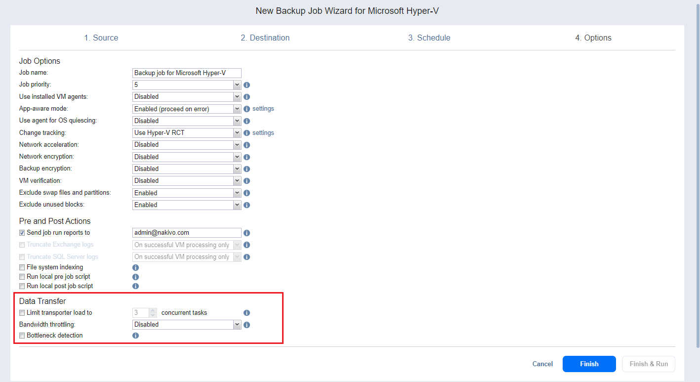 When the Bottleneck detection option is enabled, additional information is collected and recorded in NAKIVO Backup & Replication logs in the course of data transfer for the purpose of bottleneck detection. Check this option to enable the Bottleneck detection capability of the Transporters engaged in the job.