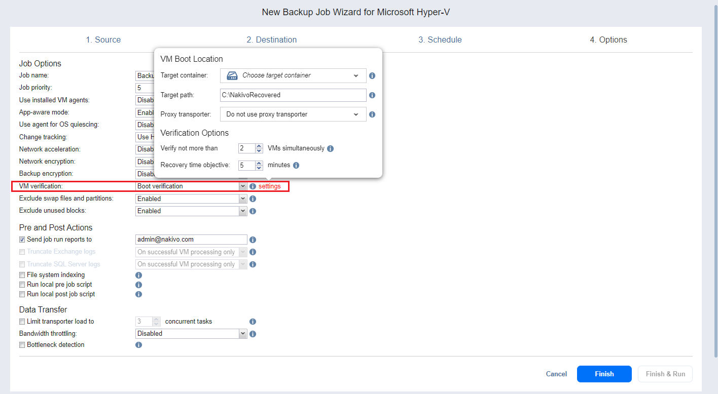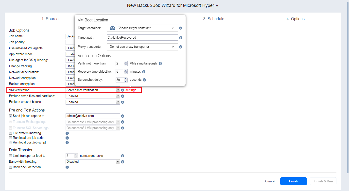 Boot verification: When enabled, all VM backups created by the job are verified as follows. After a VM backup is completed, NAKIVO Backup & Replication recovers the VM using Flash boot, disables networking to prevent network connections, and verifies that system start is successful.