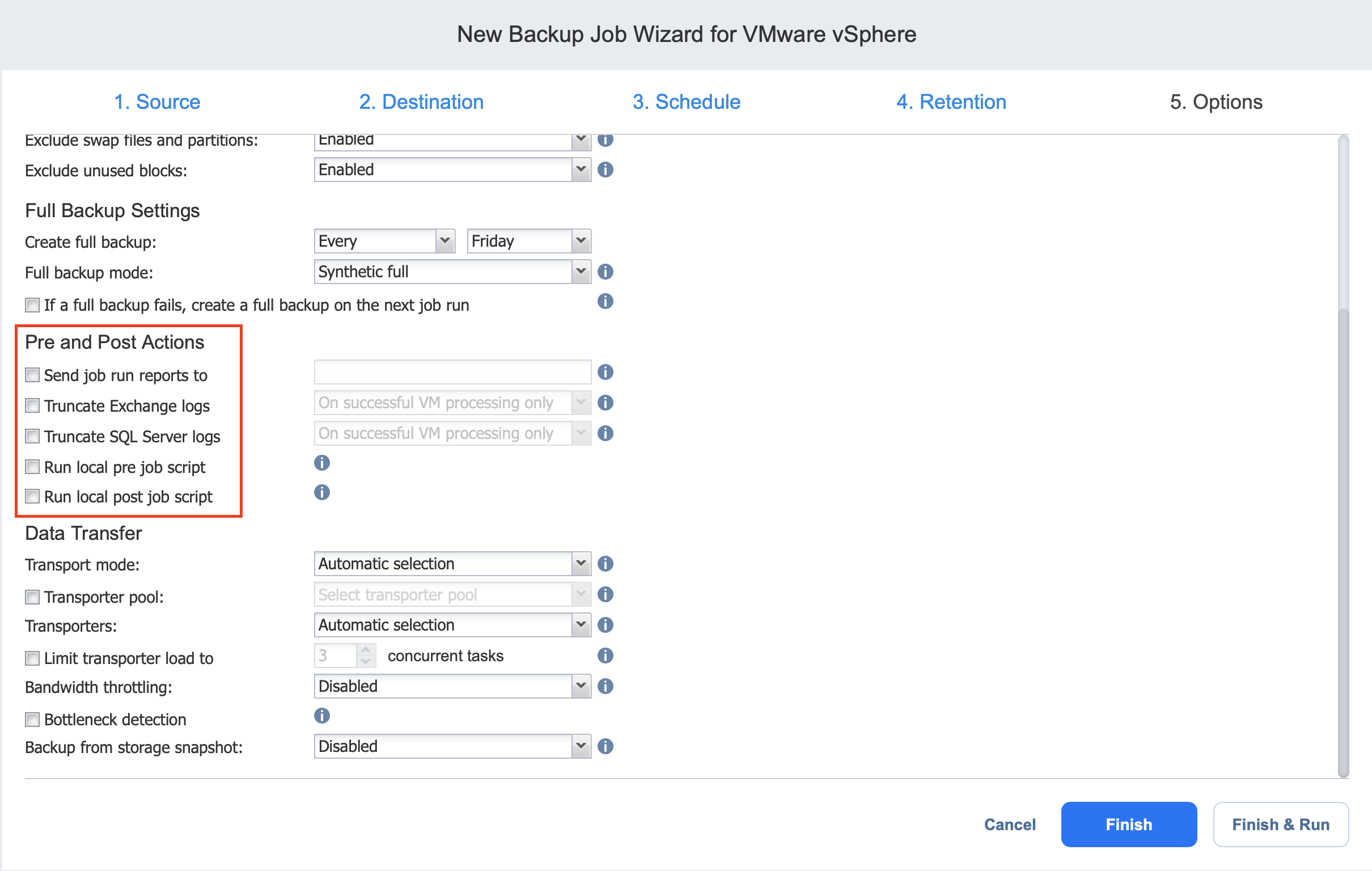 In the Data Transfer section of the Options page, you can choose a transport mode, select a Transporter to be used for reading data from source VMs, specify a b load, and configure bandwidth throttling.
