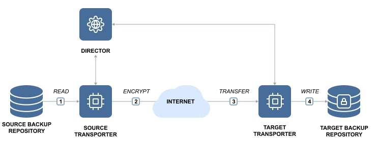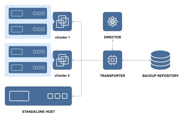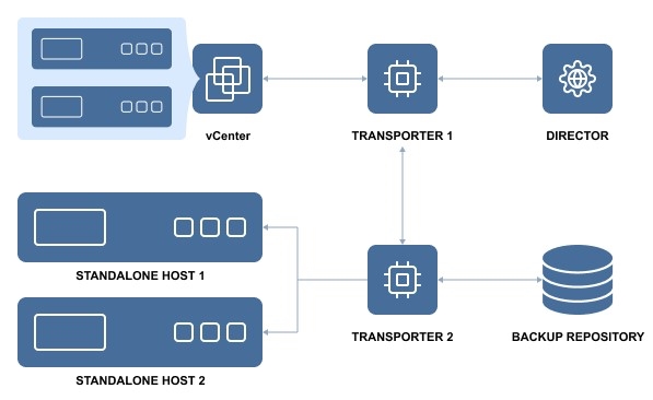 The Transporter is the component of the product that does all of the heavy lifting. It performs backup, replication, and recovery, as well as data compression, deduplication, and encryption. An instance of the Transporter is automatically installed along with the Director to enable backup, replication, and recovery out of the box. The default Transporter is called "Onboard Transporter", and it must not be removed or added to the product by another Director.