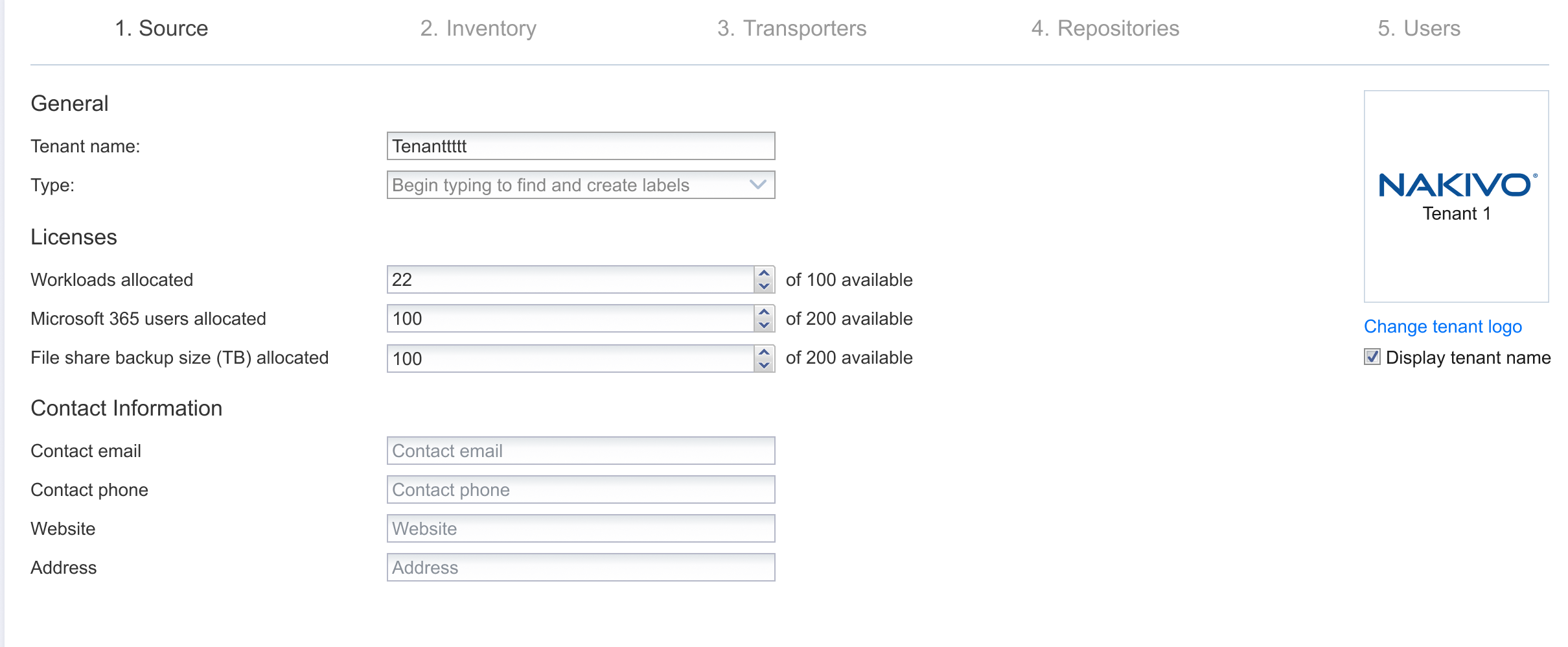 On this page of the wizard, you can provide a name for the local tenant, assign licenses to the local tenant, and enter or edit contact information for the local tenant. Additionally, the master tenant can enable VM Limitation for the new local tenant. When this option is enabled, the tenant cannot exceed the number of allocated VMs for the purpose of backup and replication. Tenants can see the number of allocated and used VMs in the licensing tab and in the job creation wizard.