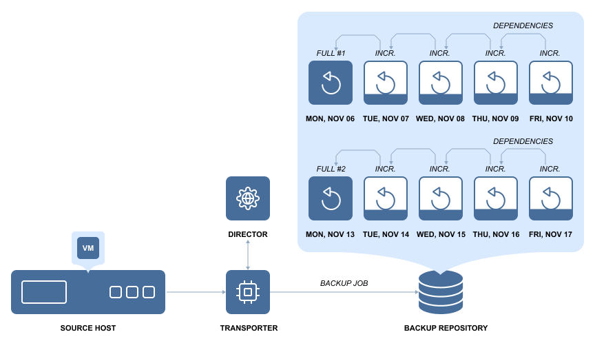 Backup data is stored in incremental backup files and full backup files. As a result, the repository maintains VM backup chains that consist of periodic full backups and multiple incremental backups created between those full backups.