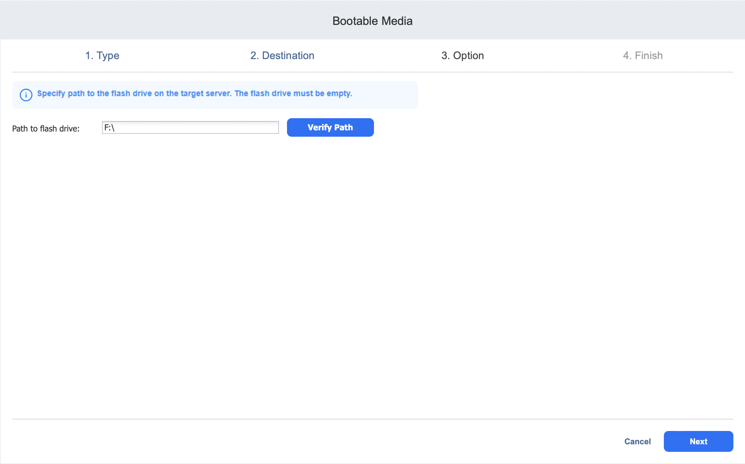 On the Option page of the wizard, specify a local path to the flash drive on the host you selected in the previous step. Optionally, verify the chosen path by clicking Verify Path.