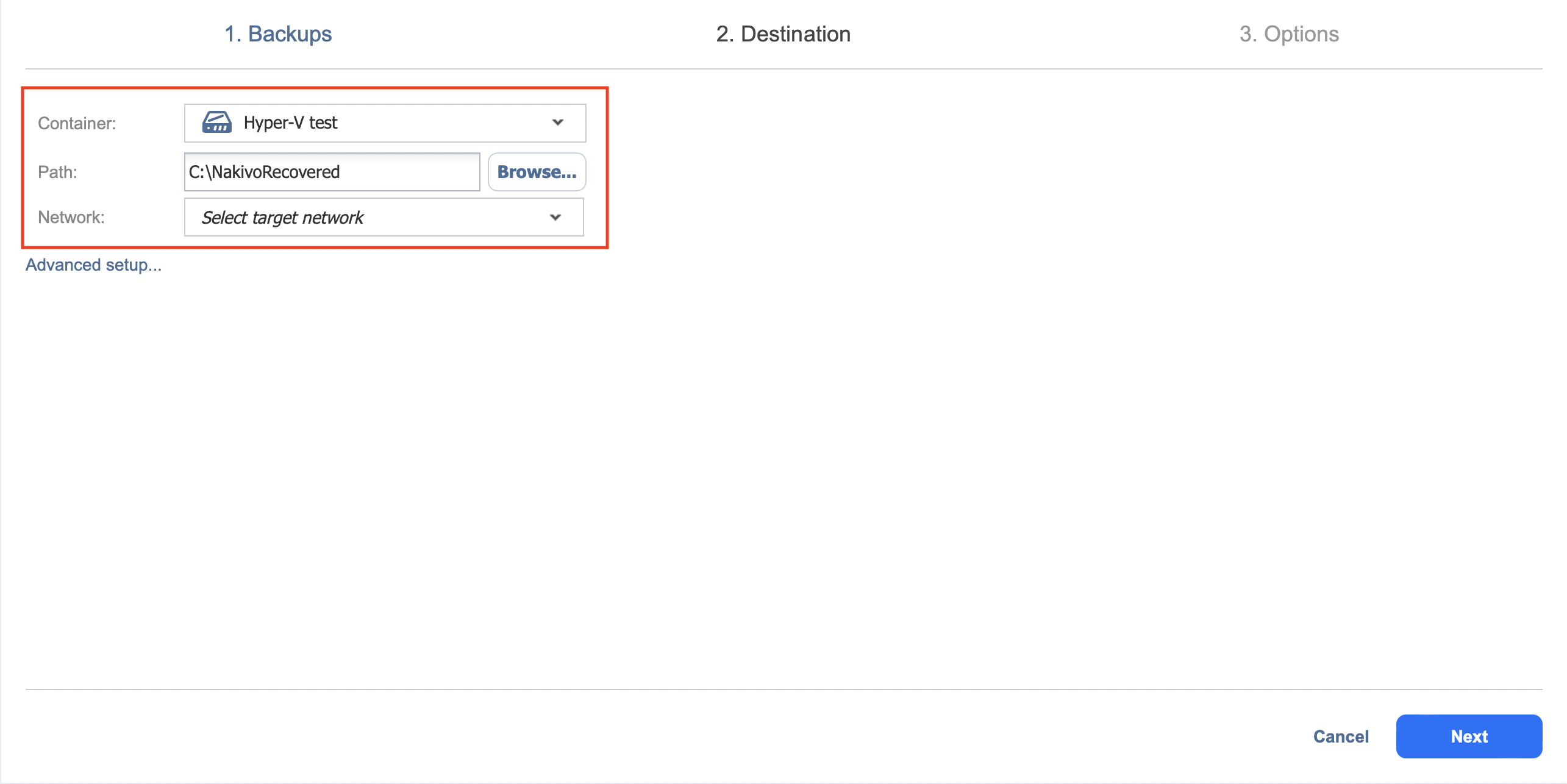 Recovery Job Wizard for Hyper-V: Destination