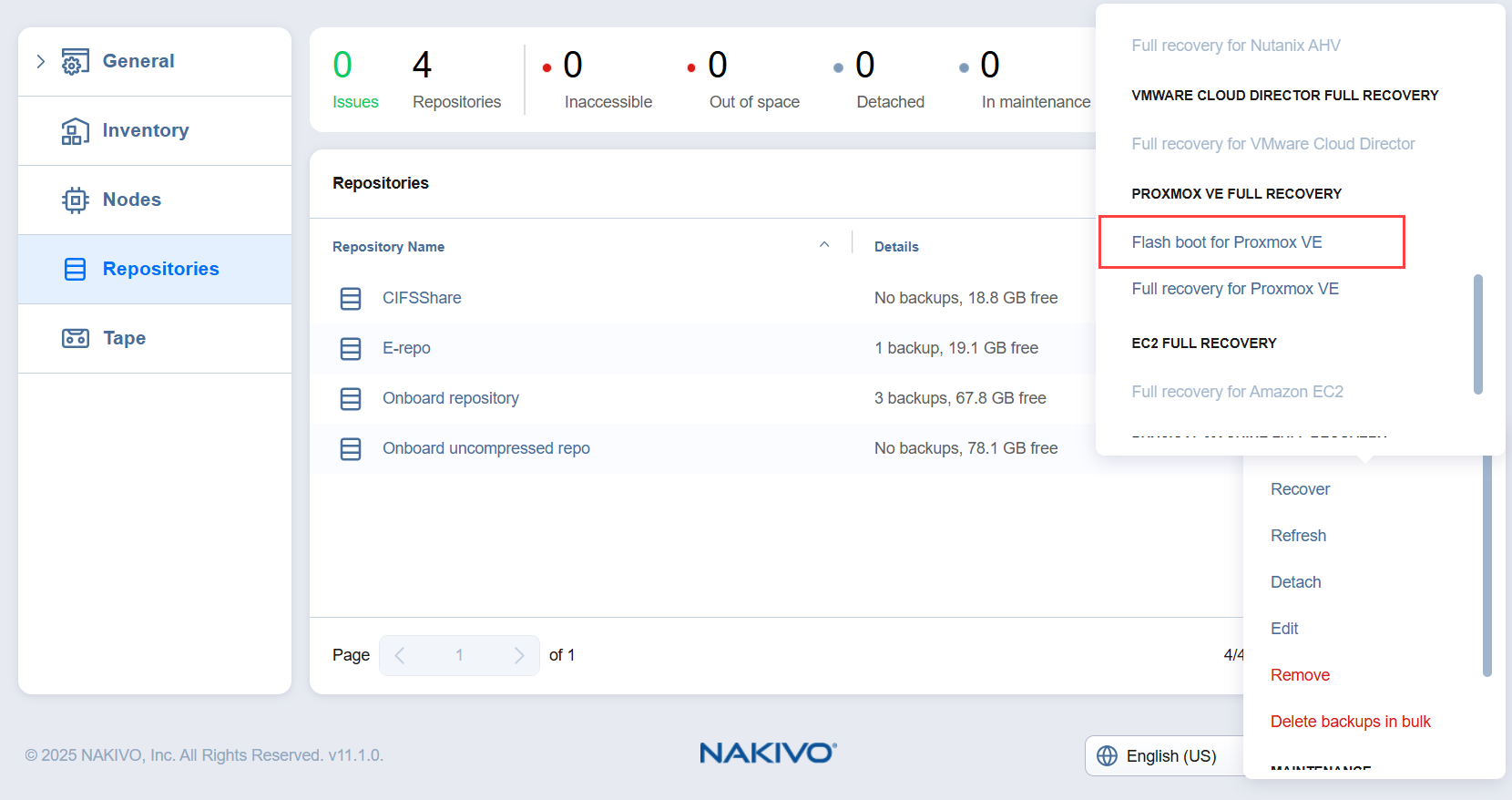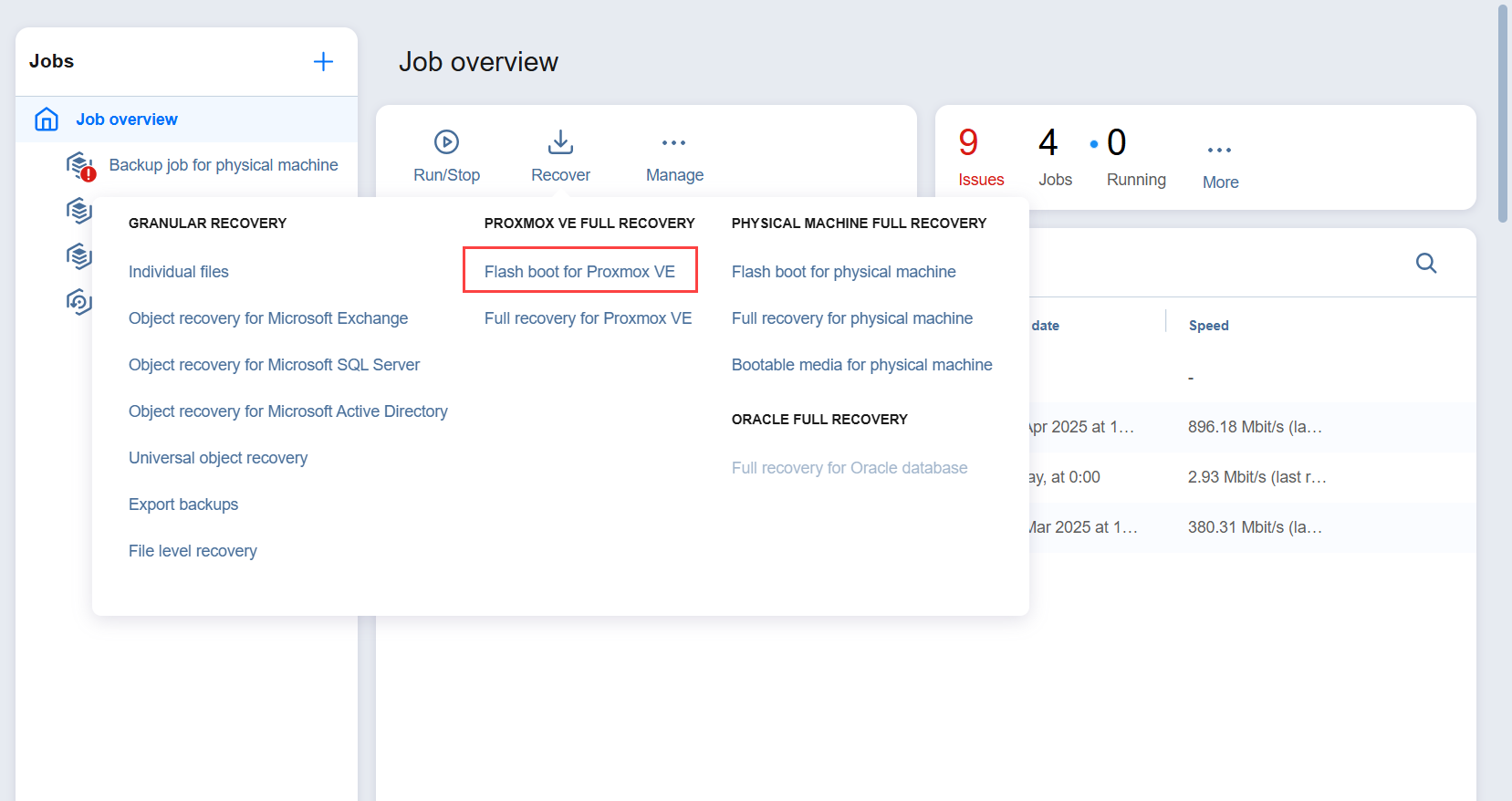 Open the Flash Boot wizard from the Data Protection menu by clicking Recover and then clicking Flash boot for Proxmox VE.