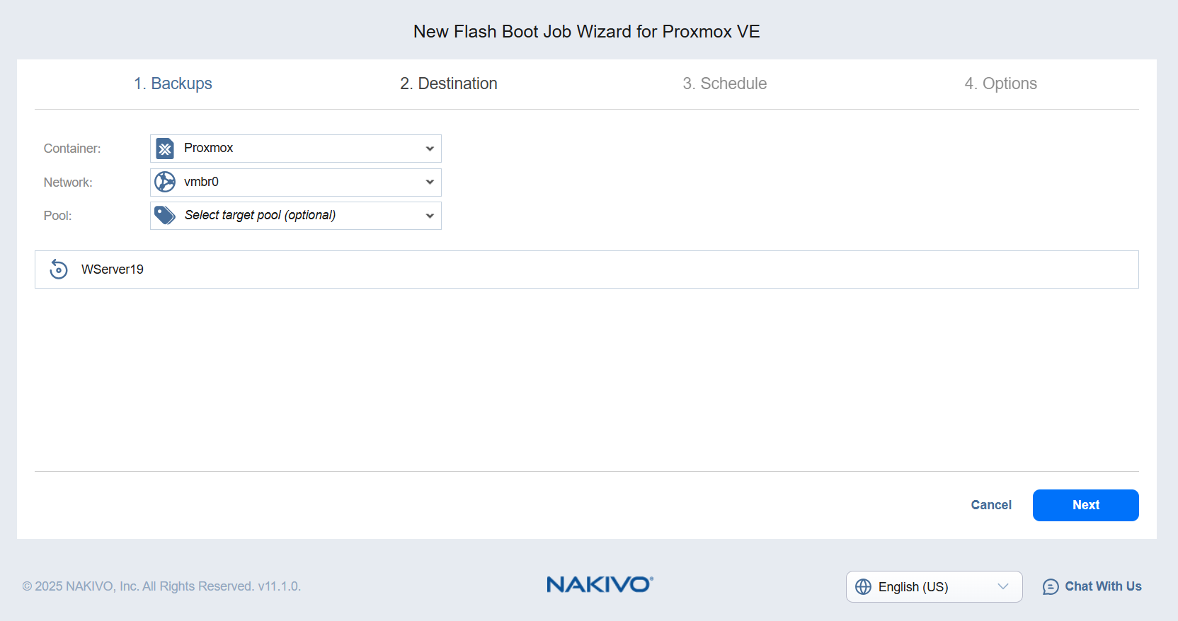 To run all VMs on the same host (cluster, or resource pool), datastore and VM folder (optional), and to connect all recovered VMs to the same network, choose a target container, datastore, VM folder and network from the appropriate drop-down lists.