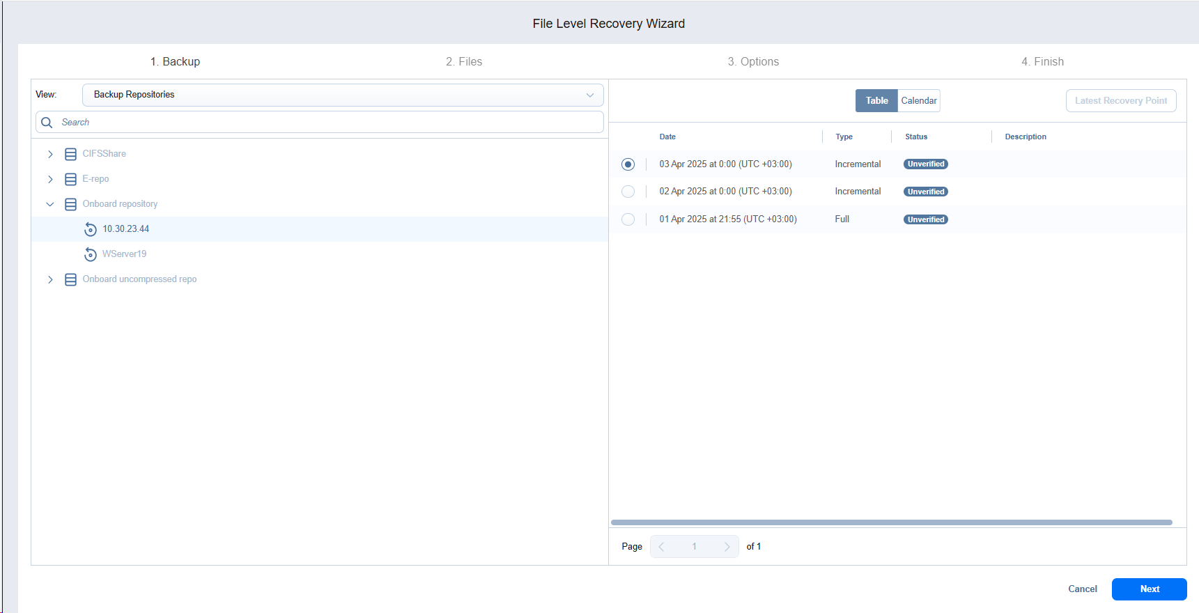 In the right pane, select the backup to open the Recovery points date picker or Recovery points table dialog box (depending on the user’s last view selection: date picker or table).