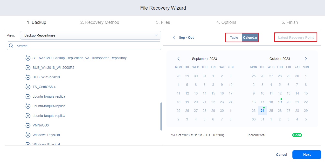 NoteClicking the Latest Recovery Point option selects the date with the latest recovery point that is not corrupted, inaccessible, or pending removal.