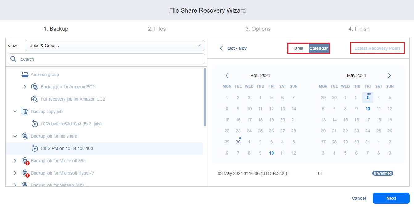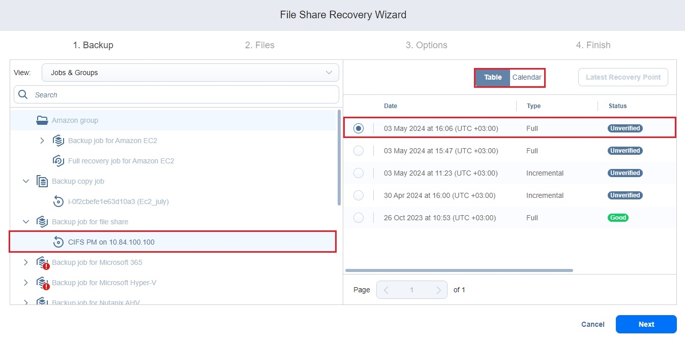 1. On the Backup page of the wizard, select a backed-up file share using either the Backup Repositories or the Jobs & Groups view in the left pane.