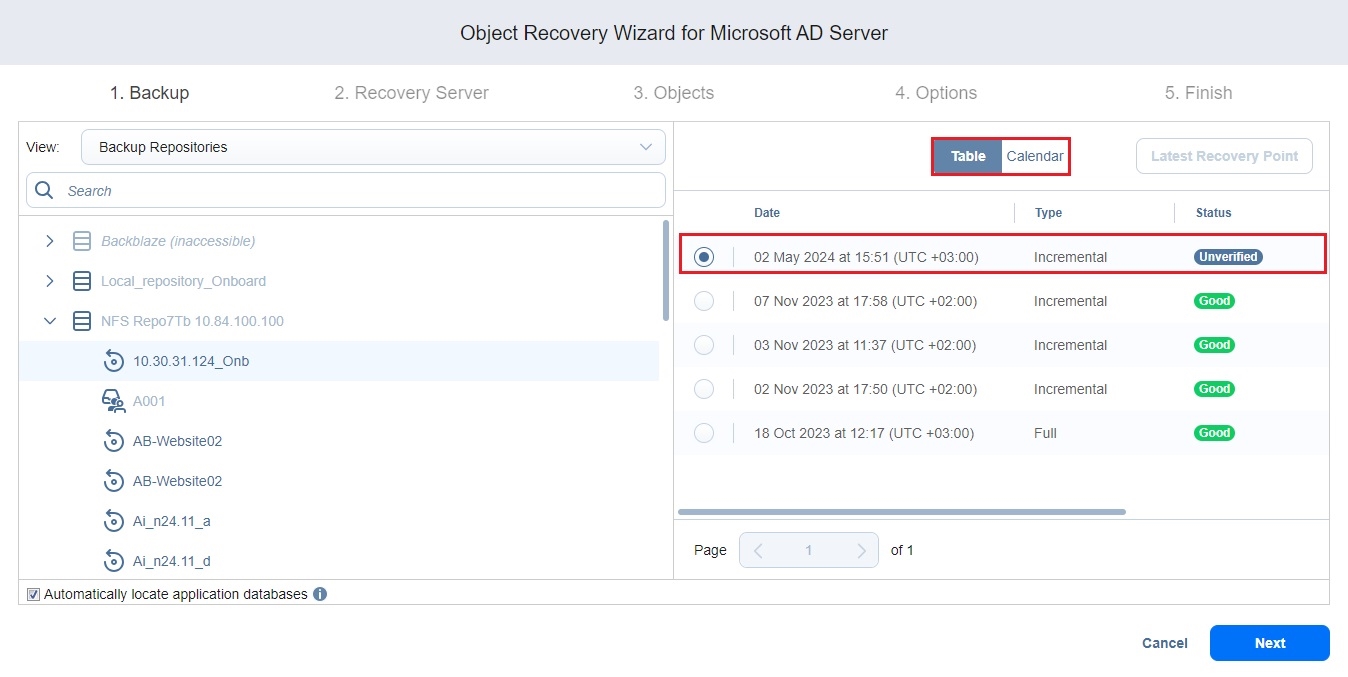 1. On the Backup page of the wizard, select a backup of a VM with the Microsoft Active Directory server using either the Backup Repositories or Jobs & Groups view in the left pane.