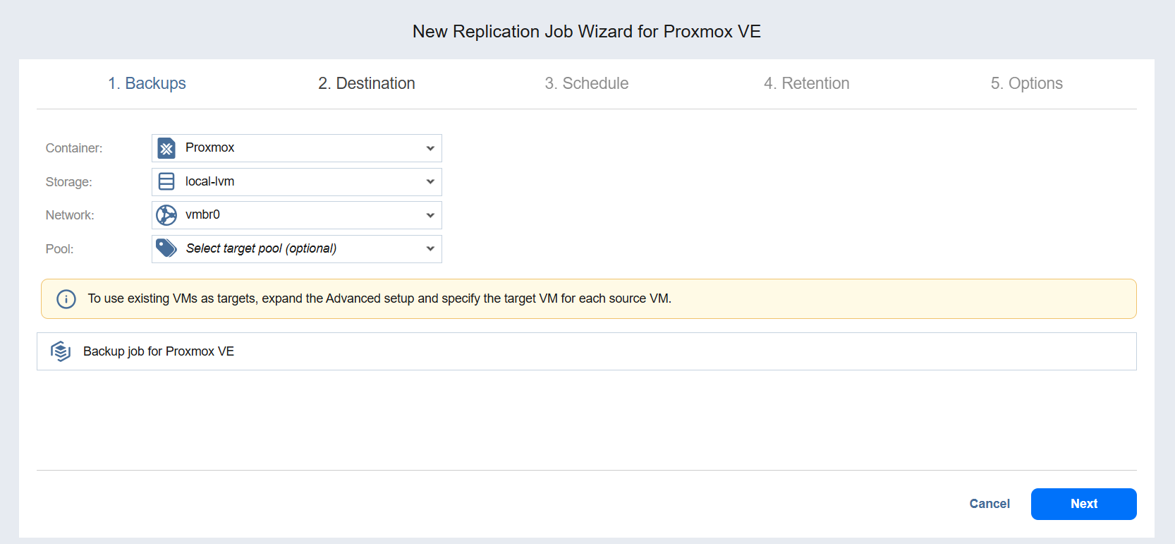 Replication Job Wizard for Proxmox VE: Destination