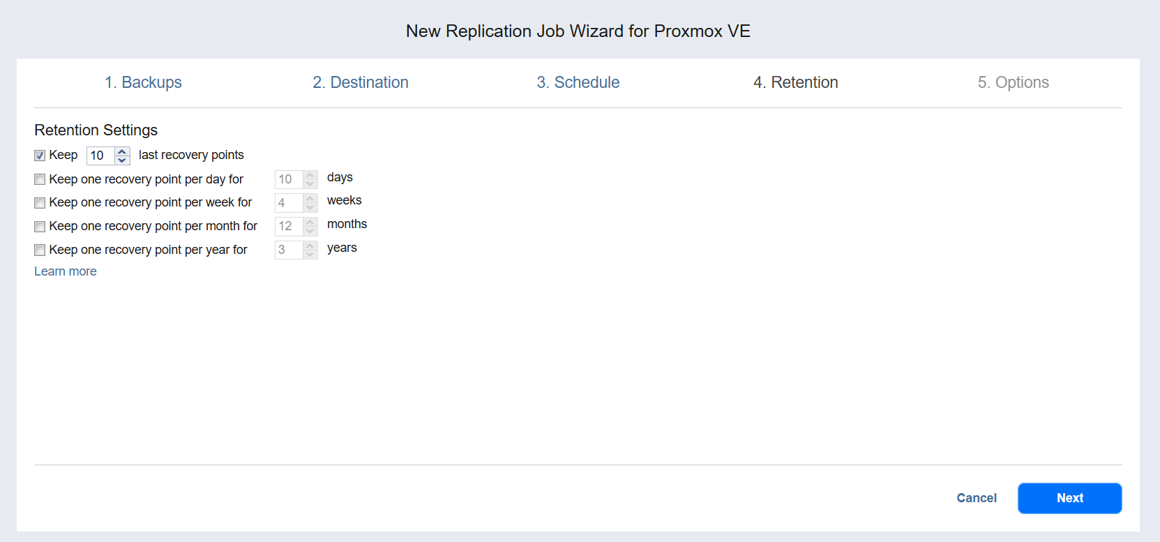 Keep x last recovery points: Retains the specified number of last recovery points for each VM in the job.