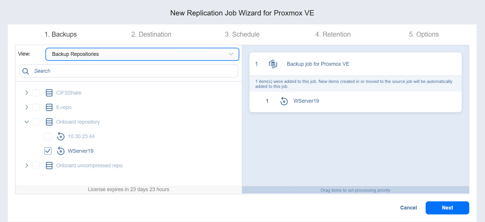 On the Source page of the wizard, select one of the views to add Proxmox VE items to your replication job.