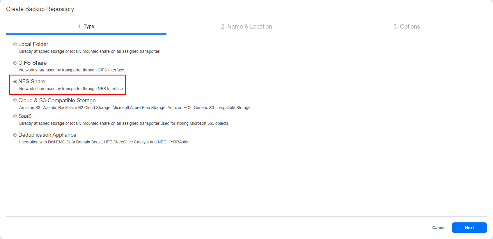 On the Type page of the Create Backup Repository wizard, select NFS Share and click Next to move to the next page of the wizard.