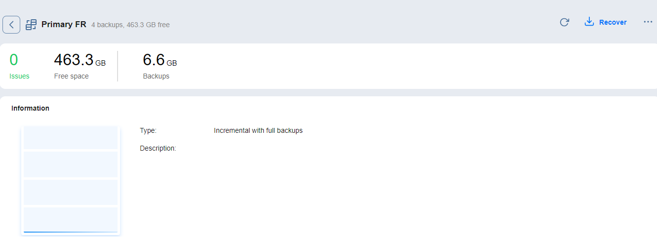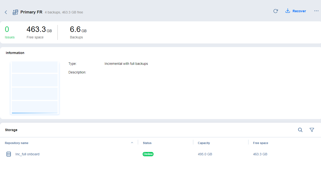 Details: The number of repository backups, amount of free space, and repository status (displayed for detached and inaccessible repositories only)