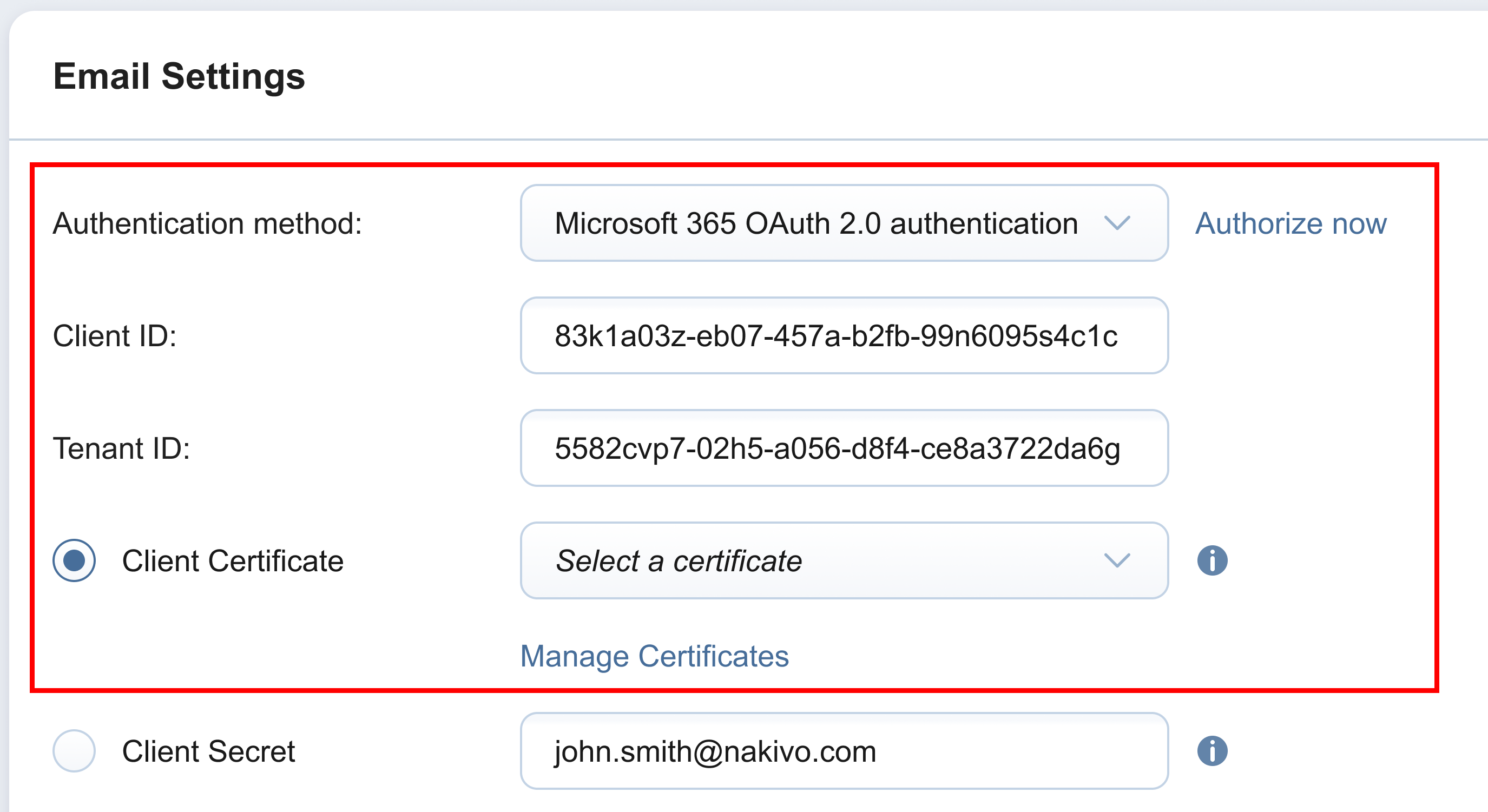 Click Authorize now to authorize NAKIVO Backup & Replication to access your Microsoft 365 account through OAuth 2.0 authentication. Ensure that the credentials are correct and the account is authenticated successfully. For more information, refer to Using Email with Microsoft OAuth Authentication.