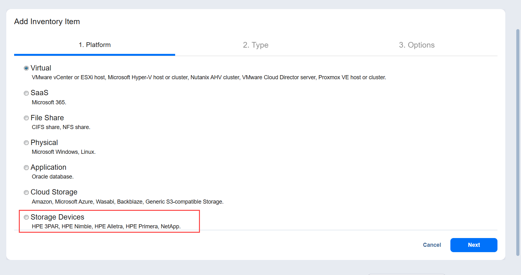 To add an HPE 3PAR storage device to the Inventory in NAKIVO Backup & Replication, follow the steps below: