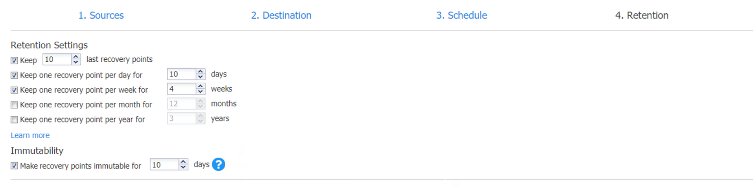 En esta sección, puede configurar la opción Hacer inmutables los puntos de recuperación durante x días . Los puntos de recuperación permanecen inmutables durante el número de días especificado.