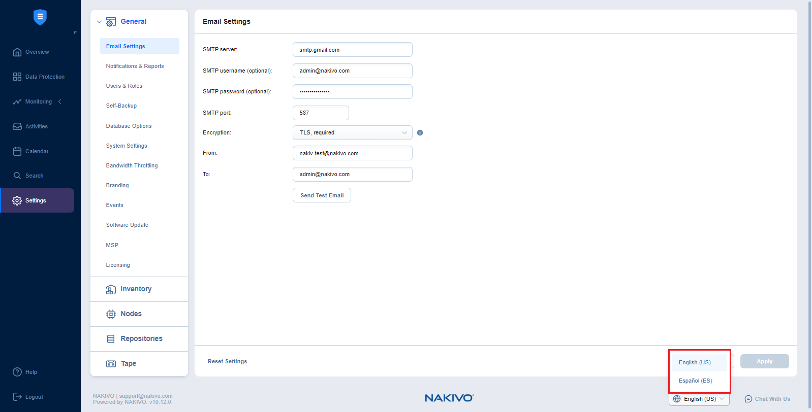 En la esquina inferior derecha de la interfaz de NAKIVO Backup & Replication, seleccione el idioma necesario en el menú desplegable.