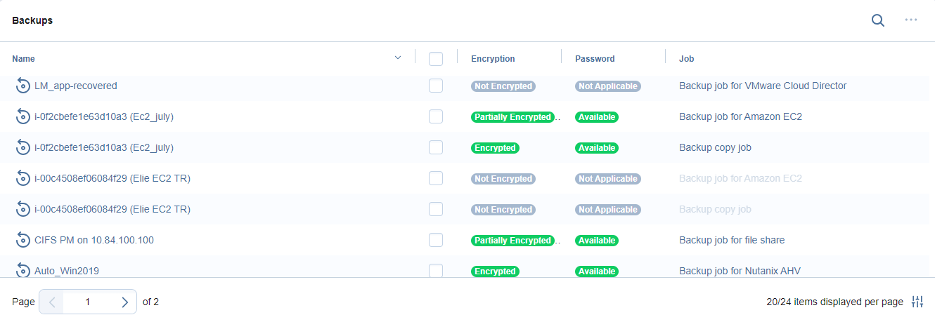 Un gran número de backups se dividen en páginas. Para encontrar un backup específico, puedes desplazarte manualmente por las páginas o buscarlo introduciendo su nombre (o parte de su nombre) en el cuadro Buscar. La tabla cambia dinámicamente para mostrar los resultados de la búsqueda que coinciden con su consulta. Al hacer clic en el botón Borrar del cuadro de búsqueda, se borra la consulta y la tabla muestra todos los backups.