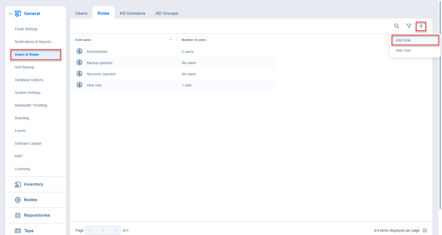 Consulte la lista de todos los roles de usuario añadidos a NAKIVO Backup & Replication.
