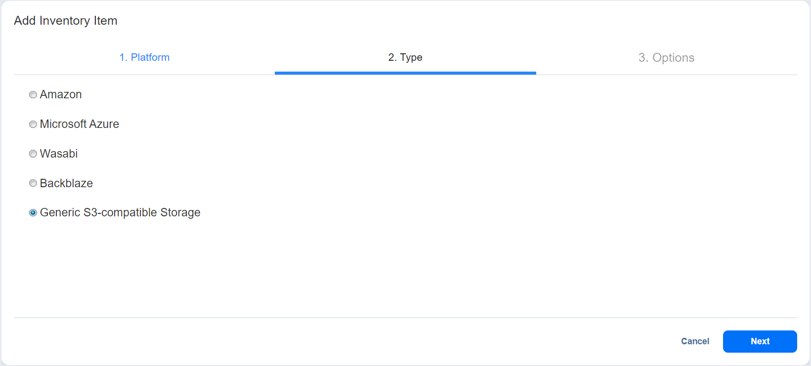 En la página Tipo del asistente, seleccione Almacenamiento genérico compatible con S3 y haga clic en Siguiente para continuar.