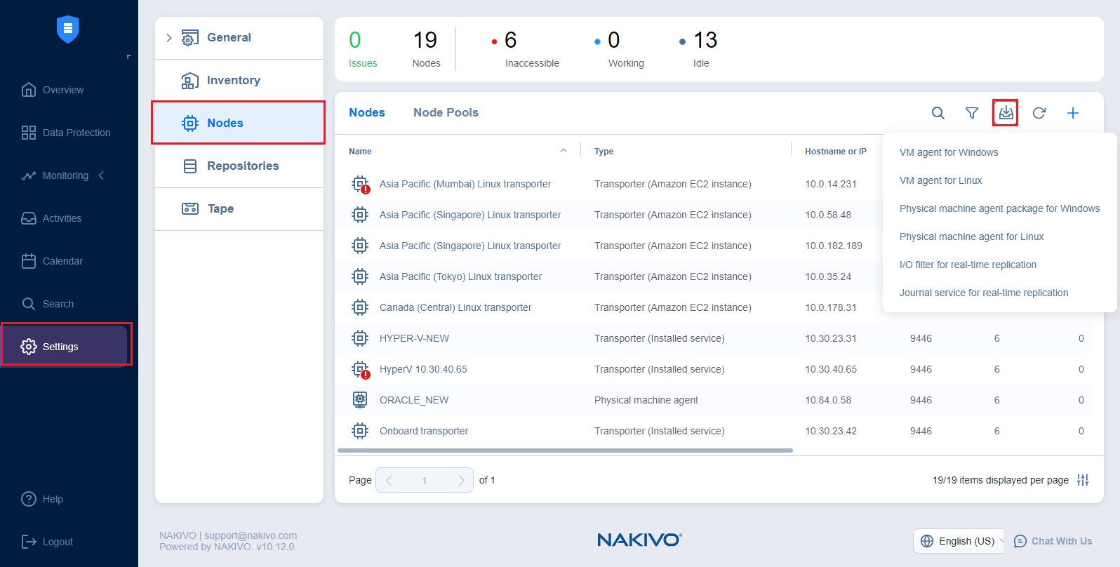 Vaya a Ajustes > Nodos, haga clic en el botón Descargar y seleccione descargar la nueva compilación del agente de máquina virtual para una máquina Windows o Linux.