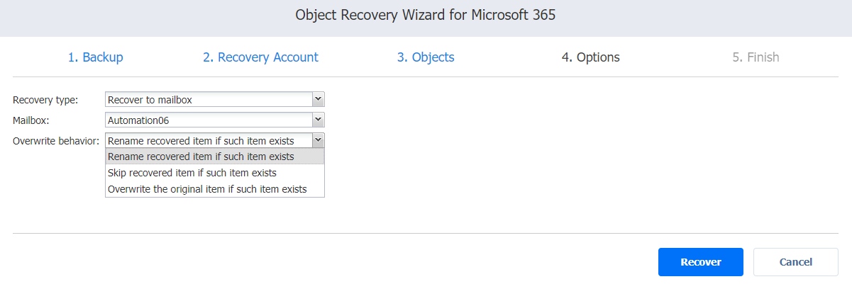 Asistente de recuperación de objetos de Microsoft 365: Opciones