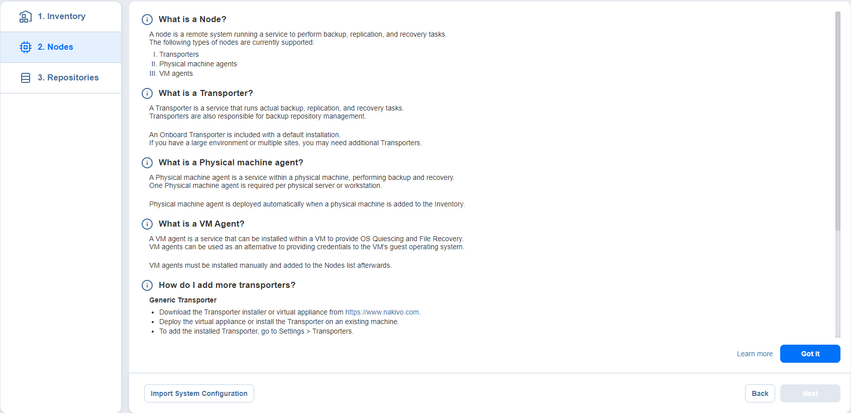 En la página Nodos del asistente, encontrará información sobre el componente Transportador de NAKIVO Backup & Replication.
