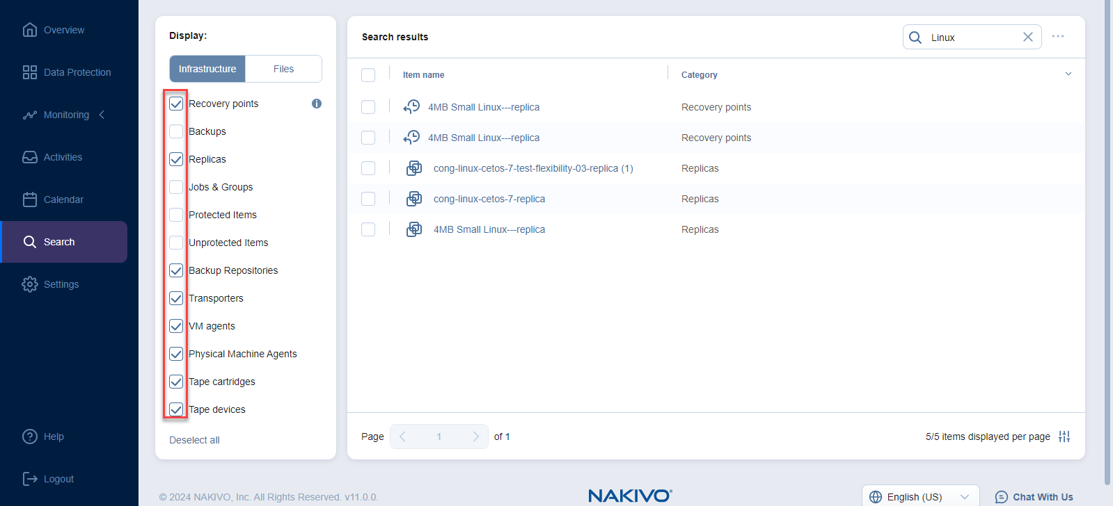 Por defecto, los resultados de la búsqueda no están filtrados. Esto significa que la búsqueda se aplica a todas las categorías de objetos NAKIVO Backup & Replication activadas por defecto.