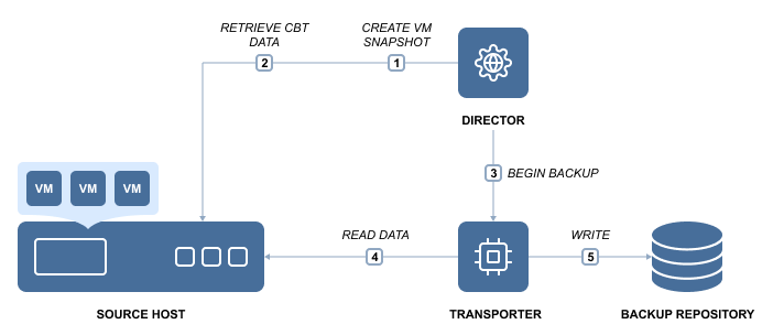 NAKIVO Backup & Replication funciona en un entorno virtual y utiliza un enfoque basado en imágenes para hacer backups de máquinas virtuales. Se trata de una aplicación sin agente que no requiere la instalación de ningún software adicional dentro del sistema operativo invitado de la máquina virtual para recuperar los datos de la misma. Aprovecha las funciones de instantánea de las plataformas de virtualización para hacer backup de máquinas virtuales. Al iniciar una copia de seguridad de una máquina virtual, NAKIVO Backup & Replication solicita a una plataforma de virtualización que cree una instantánea de la máquina virtual, que es básicamente una copia puntual de una máquina virtual que incluye su configuración, sistema operativo, aplicaciones, datos asociados, estado del sistema, etc. La instantánea se utiliza como origen de datos para hacer backups. La copia de los datos del almacén de datos de origen se realiza a nivel de bloque. NAKIVO Backup & Replication obtiene los datos de la máquina virtual, realiza la compresión y deduplicación y, finalmente, almacena los archivos de backup en el repositorio.