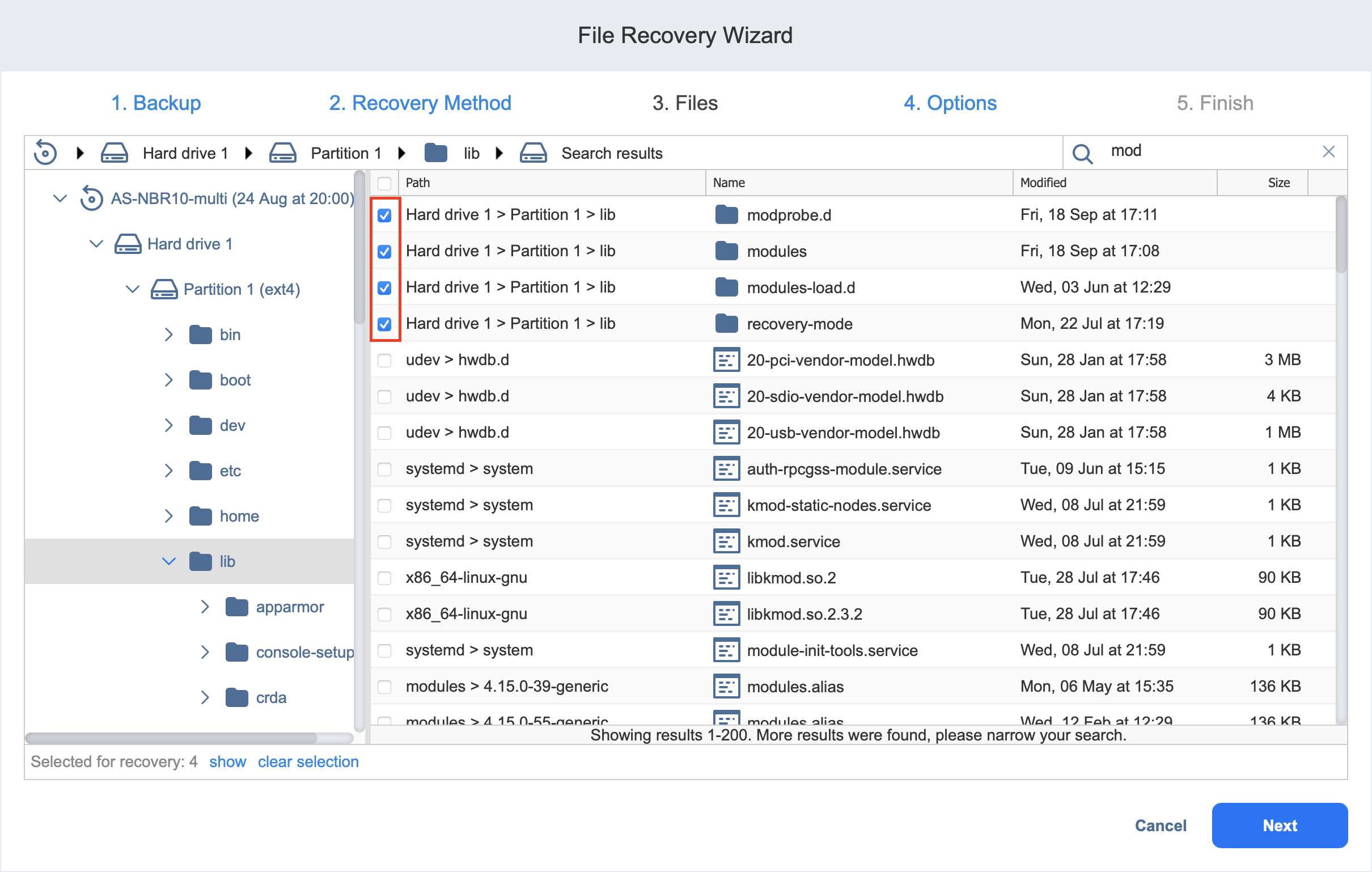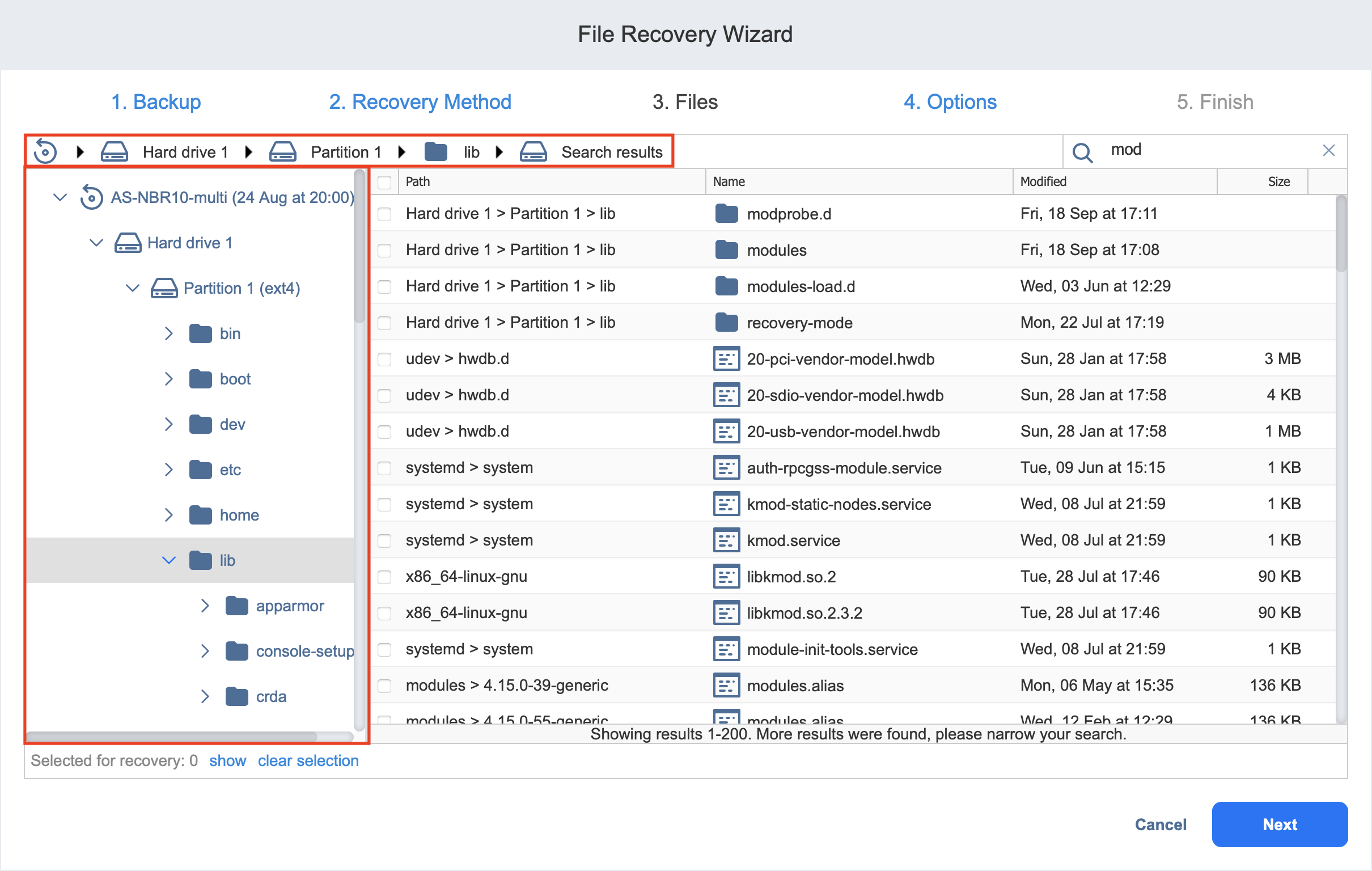 - Selección de archivos y carpetas para su recuperación