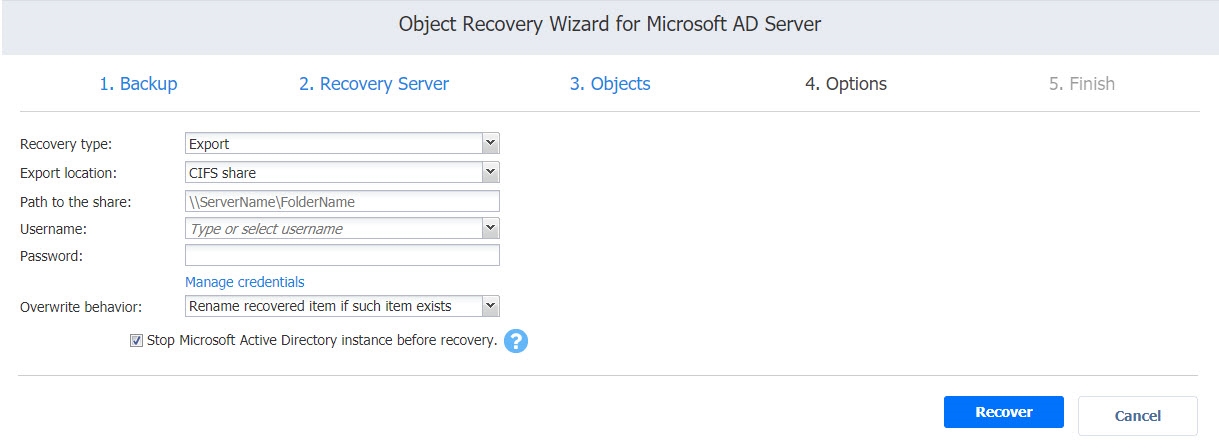 Asistente de recuperación de objetos para Microsoft AD Server: Opciones