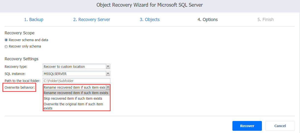 Asistente de recuperación de objetos para Microsoft SQL Server: Opciones