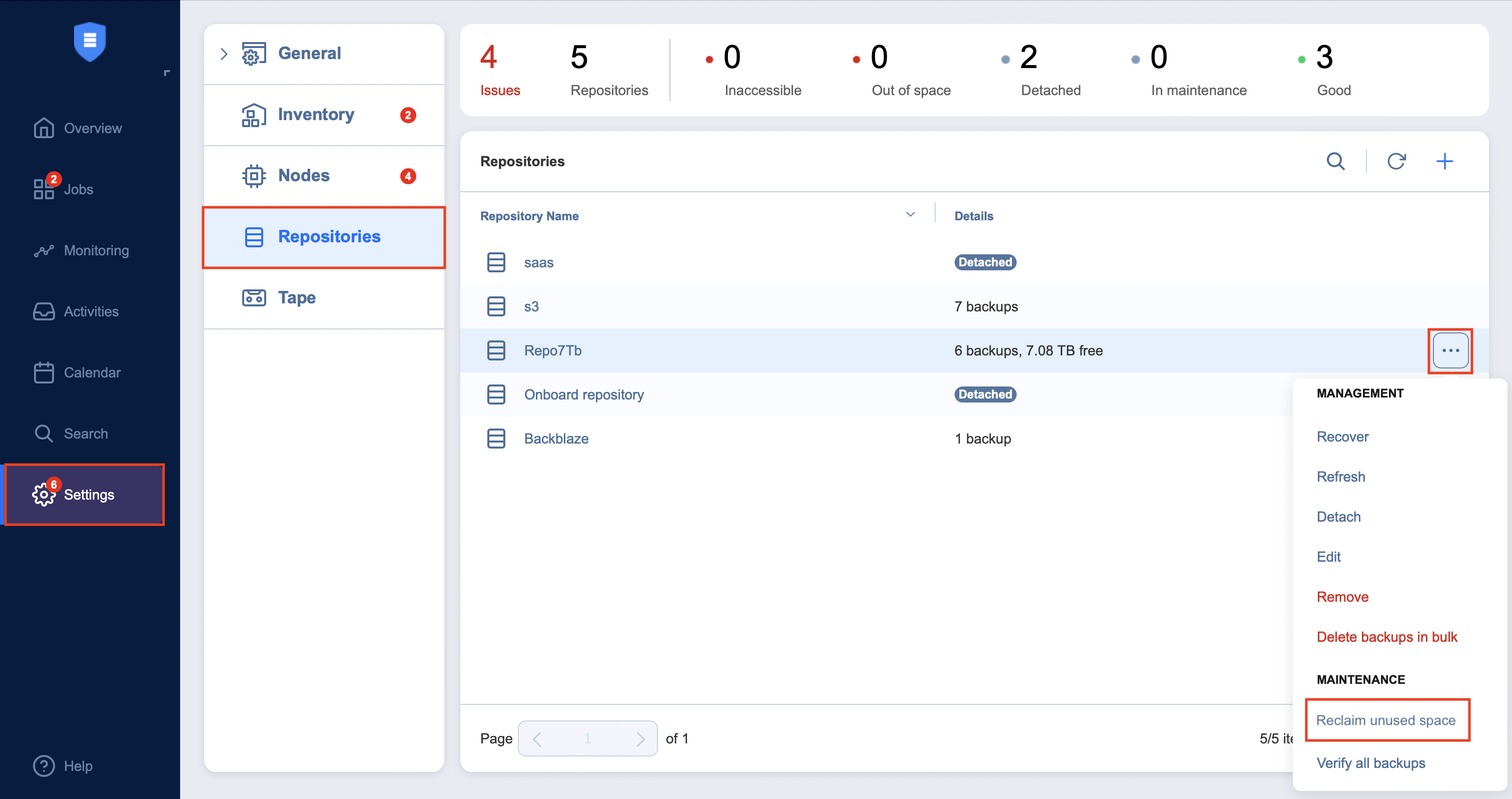 En el título del Repositorio de backups, haga clic en --- y luego en Recuperar el espacio no utilizado.
