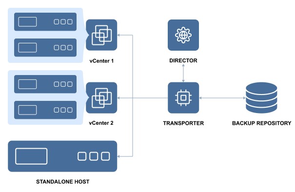 En este caso, necesitará instalar un Transportador adicional como appliance de VMware para permitir que NAKIVO Backup & Replication funcione con los vCenters y hosts ESXi de VMware, y proteja su infraestructura virtual.