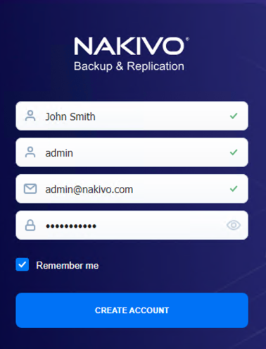 Cuando abra la página de inicio de sesión de NAKIVO Backup & Replication por primera vez, se le pedirá que cree una nueva cuenta de usuario. Esta cuenta de usuario es la cuenta de administrador que se utilizará para acceder a su instancia de NAKIVO Backup & Replication. Rellene los campos del formulario:
