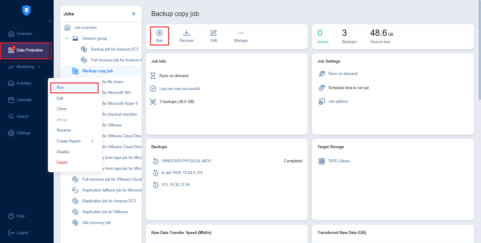 Vaya al menú Protección de datos, seleccione el job de la lista de jobs y haga clic en Ejecutar. También puede hacer clic con el botón derecho en un job para abrir el menú de acciones y hacer clic en Ejecutar.