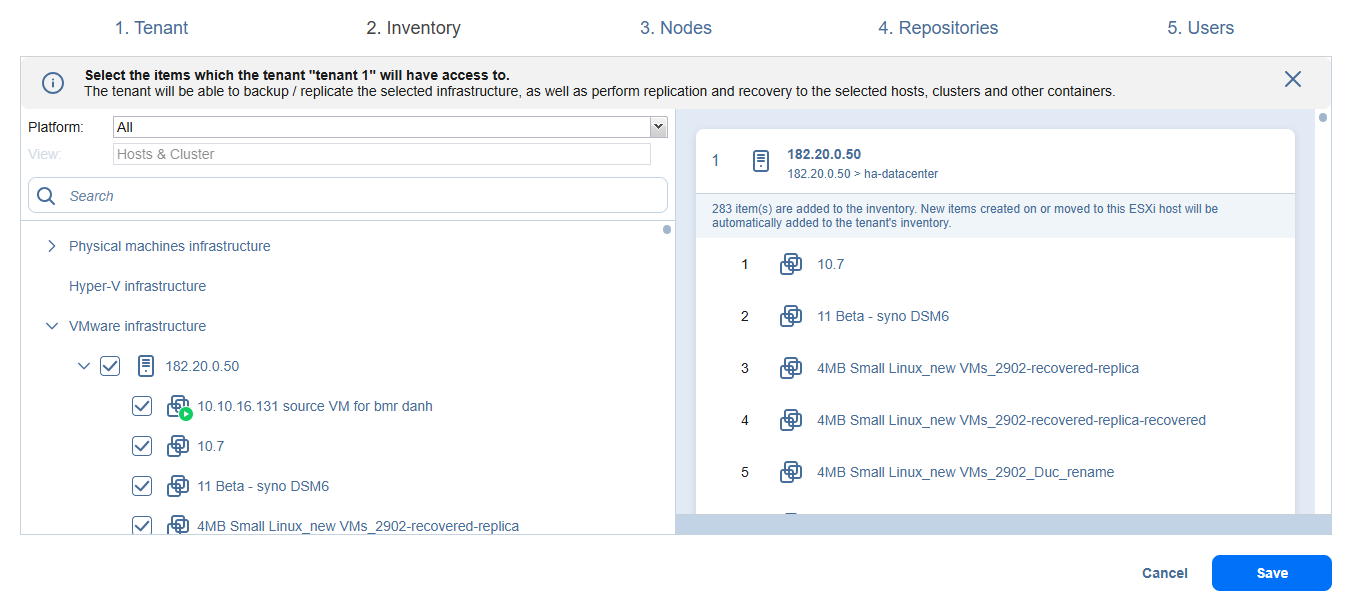 Seleccione los elementos que desea asignar al inquilino local. Los elementos seleccionados aparecen en el panel derecho.
