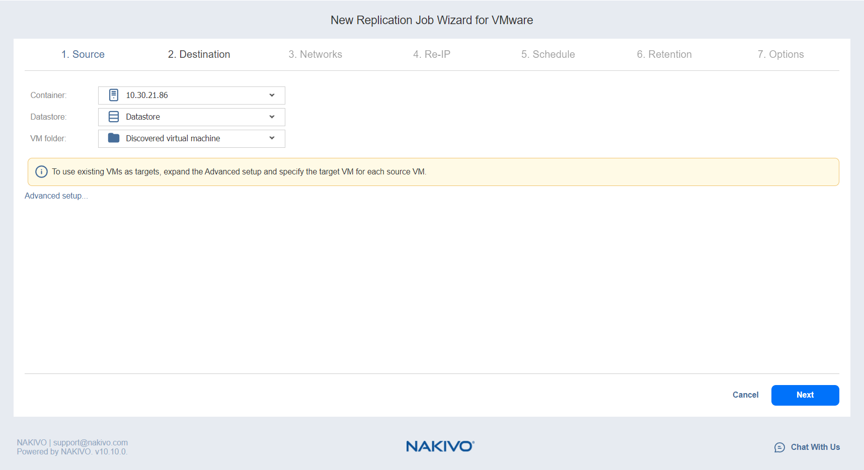 Si está creando un job de Replicación a partir de un job de backup existente(Jobs & Groups o Backup repository view), seleccione una red de destino de la lista desplegable Network.