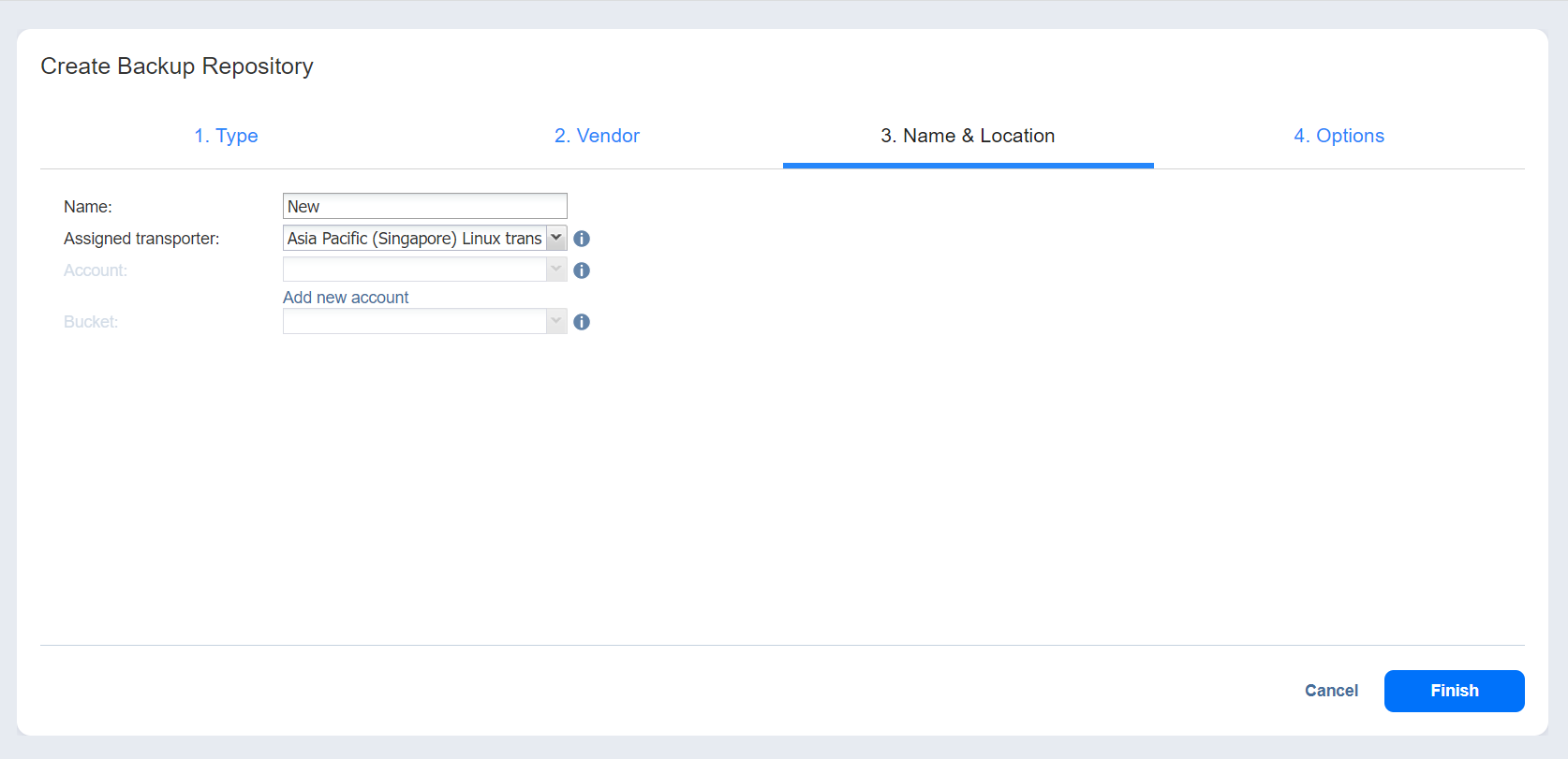 Opcionalmente, haga clic en el enlace Añadir nueva cuenta si aún no ha añadido una cuenta de almacenamiento de objetos genérica compatible con S3 al inventario.
