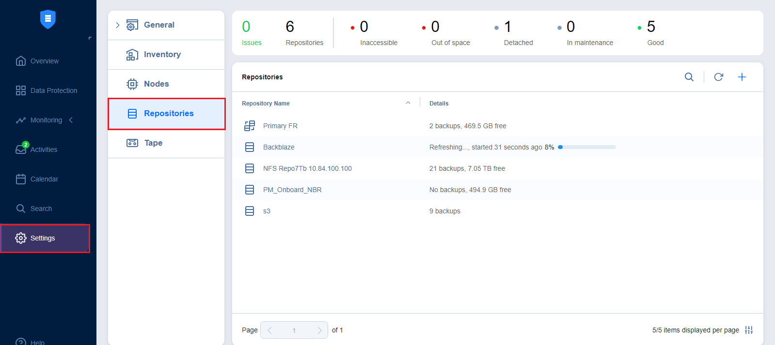Detalles: El número de backups de repositorios, la cantidad de espacio libre y el estado del repositorio (sólo se muestra para repositorios desconectados e inaccesibles).
