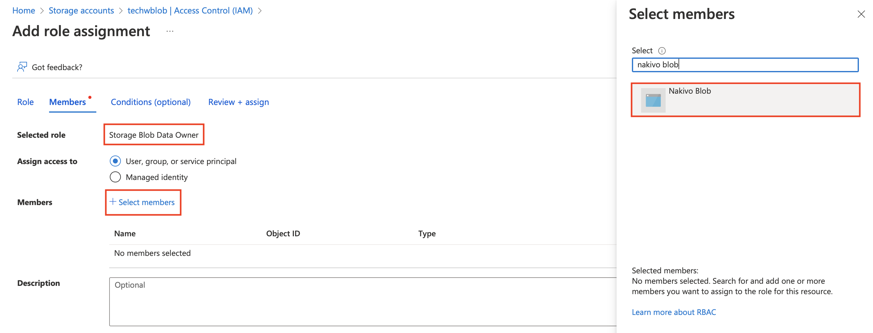Para añadir una cuenta de Microsoft Azure Storage a NAKIVO Backup & Replication, la cuenta debe estar registrada en Azure Active Directory. Además, NAKIVO Backup & Replication debe tener asignado un rol apropiado dentro del control de acceso de Azure. Consulte la sección anterior Configuración de una cuenta de almacenamiento de Microsoft Azure para obtener más detalles.