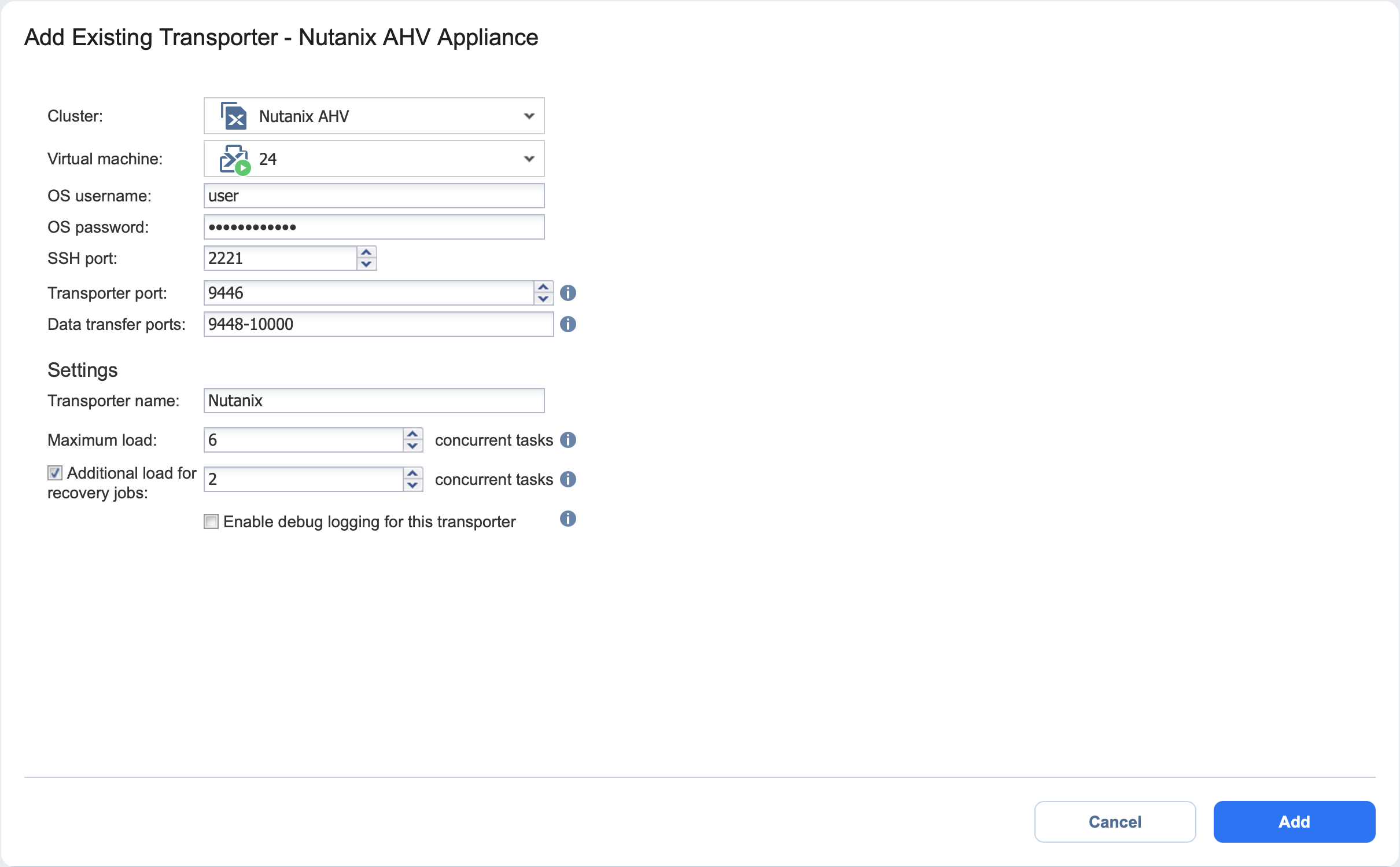 En el cuadro de diálogo Add Existing Transportador - Nutanix AHV Appliance, introduzca las siguientes opciones: