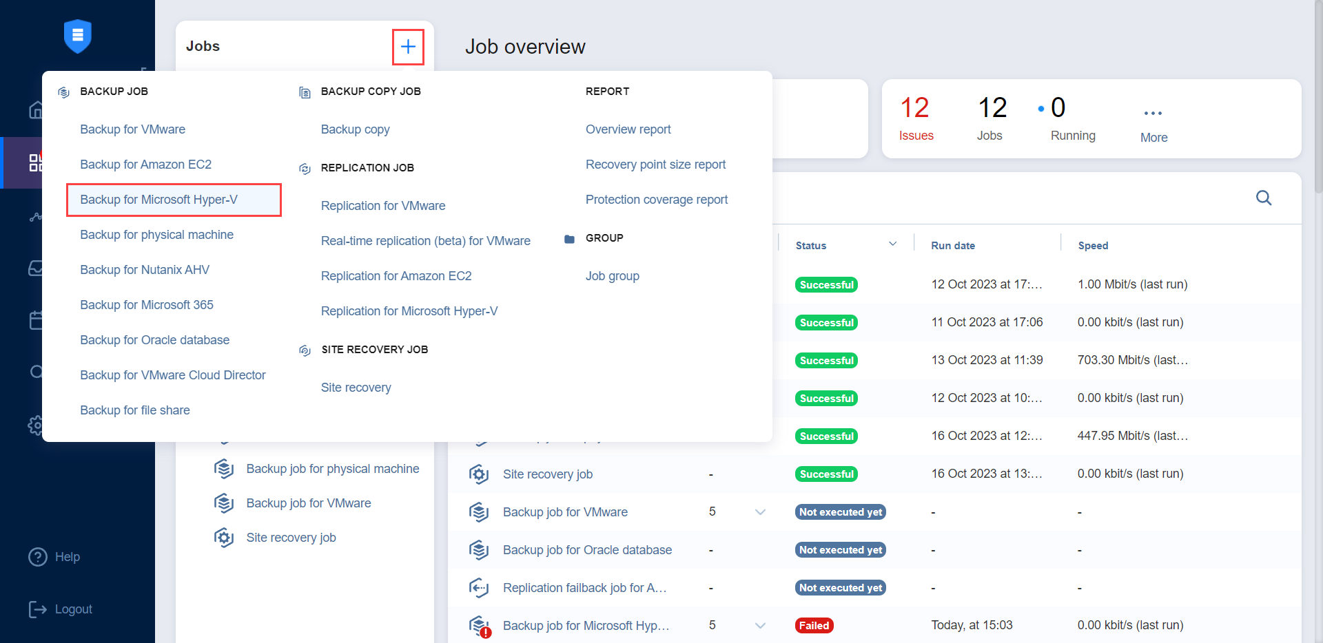 With NAKIVO Backup & Replication, you can back up Hyper-V VMs by creating a backup job that specifies which VMs should be backed up, where the backups should be located, how often the backup should occur, and what backup options should be used. To create a Hyper-V backup job, click the plus Create button in the Data Protection menu and then click Backup for Microsoft Hyper-V.