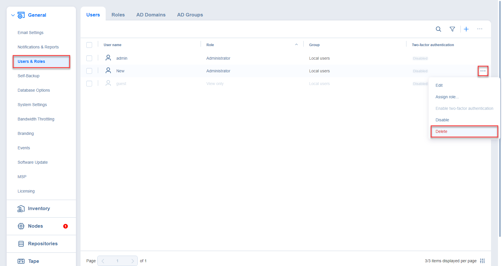 The Users & Roles page opens in the Users view. Hover over the local user you wish to be deleted, and then click the ... (ellipsis) icon in the rightmost cell of the row.